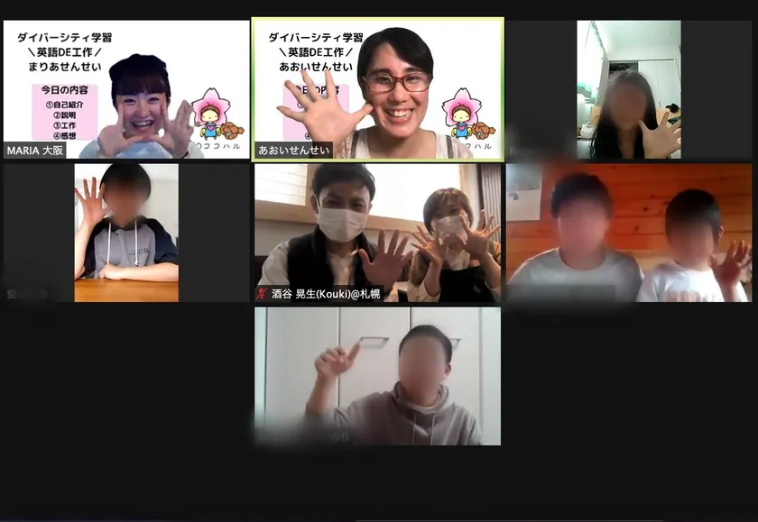 また、ダイバーシティ学習の開催に関しては、各ご家庭にてオンラインをつないで3組6名の皆さまが参加してくれました。画面上ですが、先生が英会話もおりまぜながら一人ひとりに声掛けをしてくださり、指とスタンプインクで作品を創っていく学習内容は、みんな楽しくて夢中になり終わる時間までがあっという間で、お子さんもご家族も笑顔が見えました。