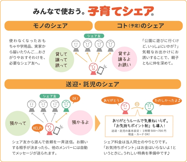 地域の顔見知り同士で「モノ」・「予定」・「送迎託児」をシェアする交流プラットフォーム「子育てシェア」を活用し、地域コミュニティーの中での頼り合いを促進していきます。