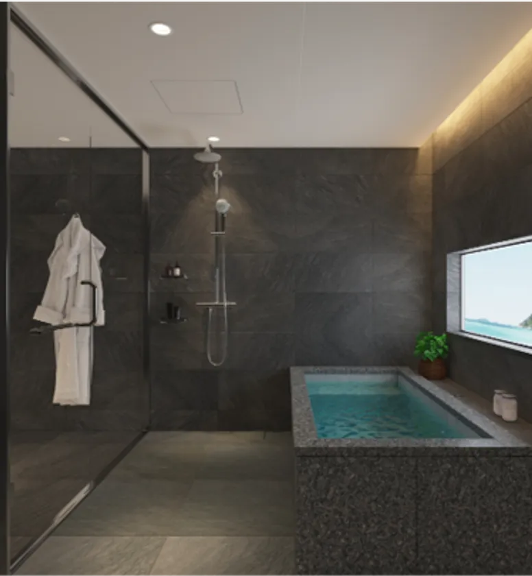 アステックは、長年、旅館・ホテルの業務用浴槽で培った匠技術を結集、浴槽内部・框(かまち)共に厳しい防水基準を満たしながら、樹脂製浴槽とは全く異なる圧倒的質感・ラグジュアリー感の天然石(十和田石・御影石)を贅沢に使用したERNデザイン浴槽、ホテル用質感を随所に入れ込みました。また、温泉地域にはアステック独自の温泉泉質対応の劣化軽減「温泉ACR工法」にも対応可能のホテル宿泊施設仕様になります。「旅のお部屋時間に、癒しの湯浴み、魅せるホテル旅館に!」をスローガンに、温泉ホテル・旅館宿泊施設に、家族が温泉を楽しめる旅のプライベート「湯浴み」時間を提供します。「WABURO Premier RESORT」、「魅せるお部屋時間」作りで、心も身体もリラクゼーションの彼方へと誘います。