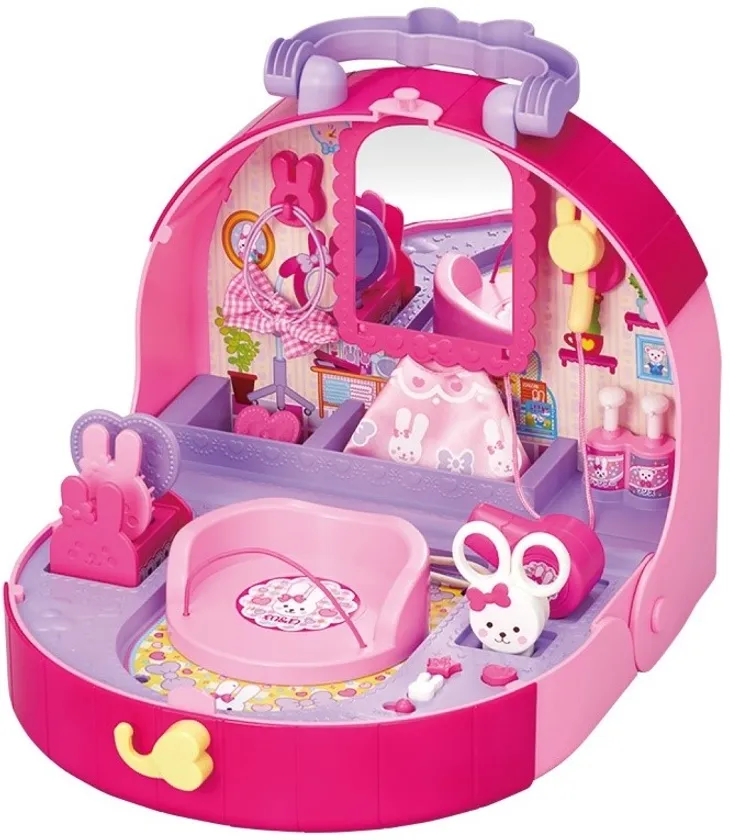 ドライヤーやシャンプー&リンスのボトル、うさぎさんのはさみなどの小物が動く・しゃべるギミックで美容室ごっこを盛り上げてくれます。