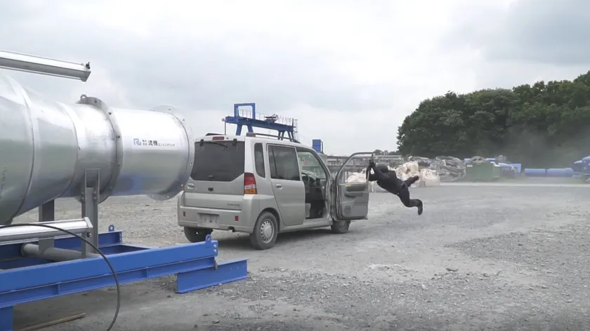 内容 : 大型送風機『エアロ★MAX』の最大瞬間風速80m/sまでの風による人工台風実験