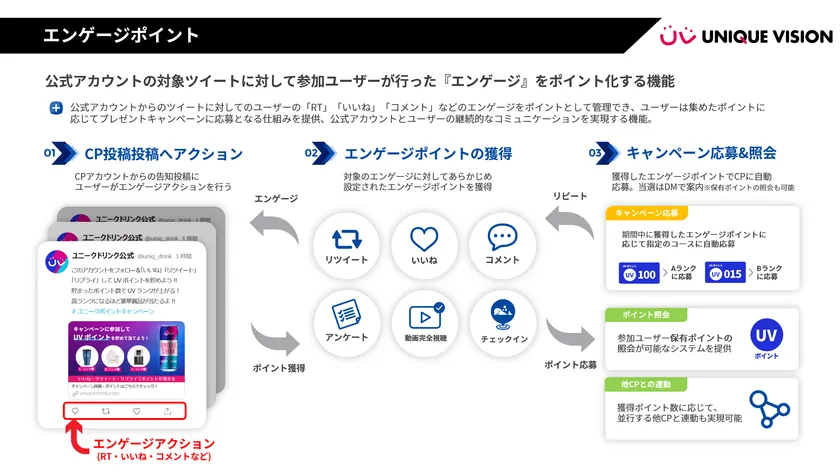 公式アカウントが投稿した対象ツイートへのRT・いいねや、指定ハッシュタグ+公式アカウントへのメンションを含むツイートなど、キャンペーン参加へのアクションをポイント化することができます。