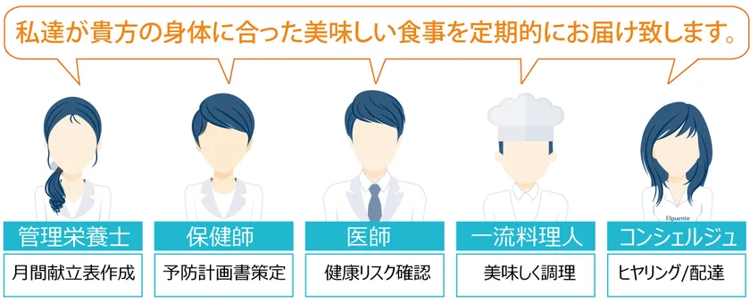 そこで、当社では、医師、保健師、栄養士、一流シェフによって、一人一人の身体に合った美味しい食事を作り、定期的に配送する日本初のサービスを開始致します。