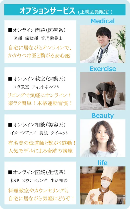 また、毎日、ヨガ教室やフィットネスジムとオンラインで繋いで本格的な講座を受けることもできます。こだわり野菜(無農薬)やこだわり緑茶(有機栽培)など会員様限定の通販もご用意しています。