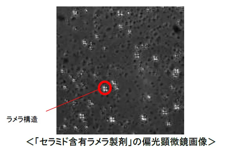 セラミドを安定的に配合するため、ラメラ状に構成した「セラミド含有ラメラ製剤」を開発しました。ラメラ構造は偏光顕微鏡で観察すると、マルテーゼクロスと呼ばれる十字型の像として確認することができます。