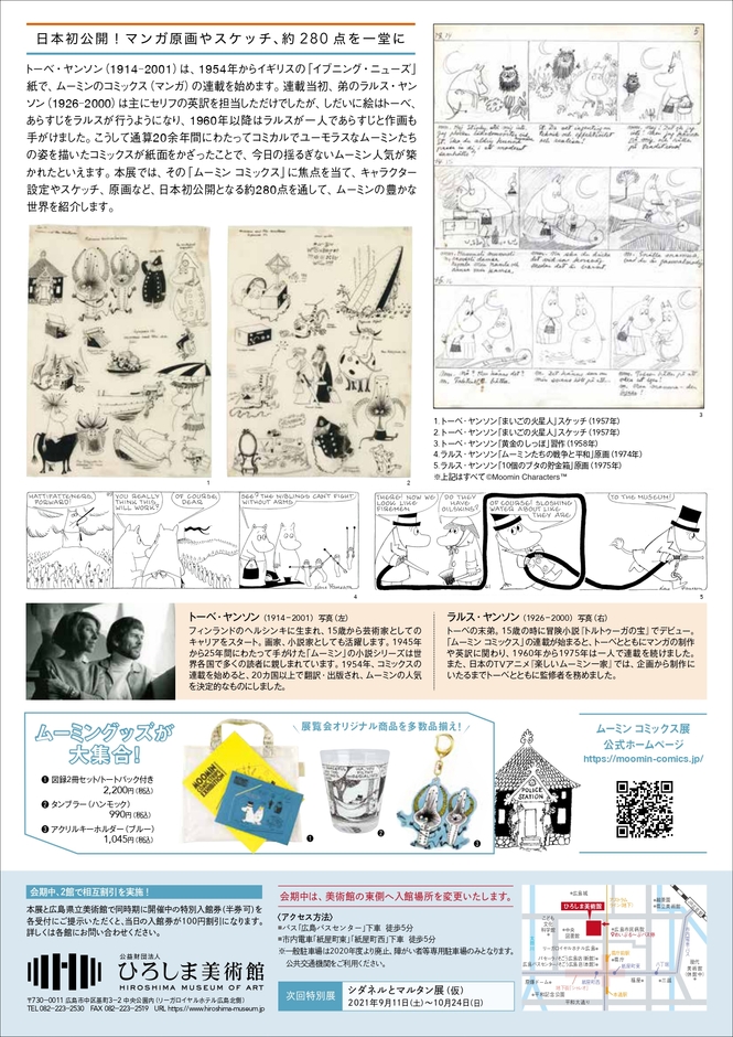 ※新型コロナウイルス感染防止対策として、「ムーミン コミックス展」会期中の全日程で先着順の整理券配布による入館制限を実施いたします(入館時間帯の希望および予約は受け付けておりません)。詳しくは以下(PDF)をご確認ください。お客様にはご不便をおかけいたしますが、ご理解、ご協力をお願い申し上げます。整理券配布状況はひろしま美術館 公式ツイッターアカウントでお知らせいたします。公式ツイッターアカウントはこちら(https://twitter.com/HiroshimaMuseum)