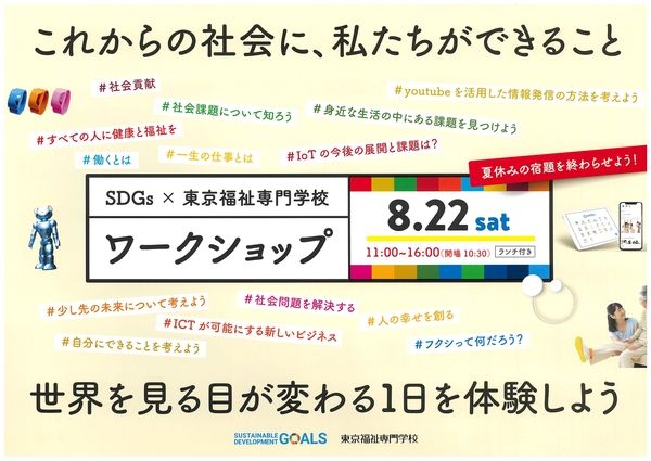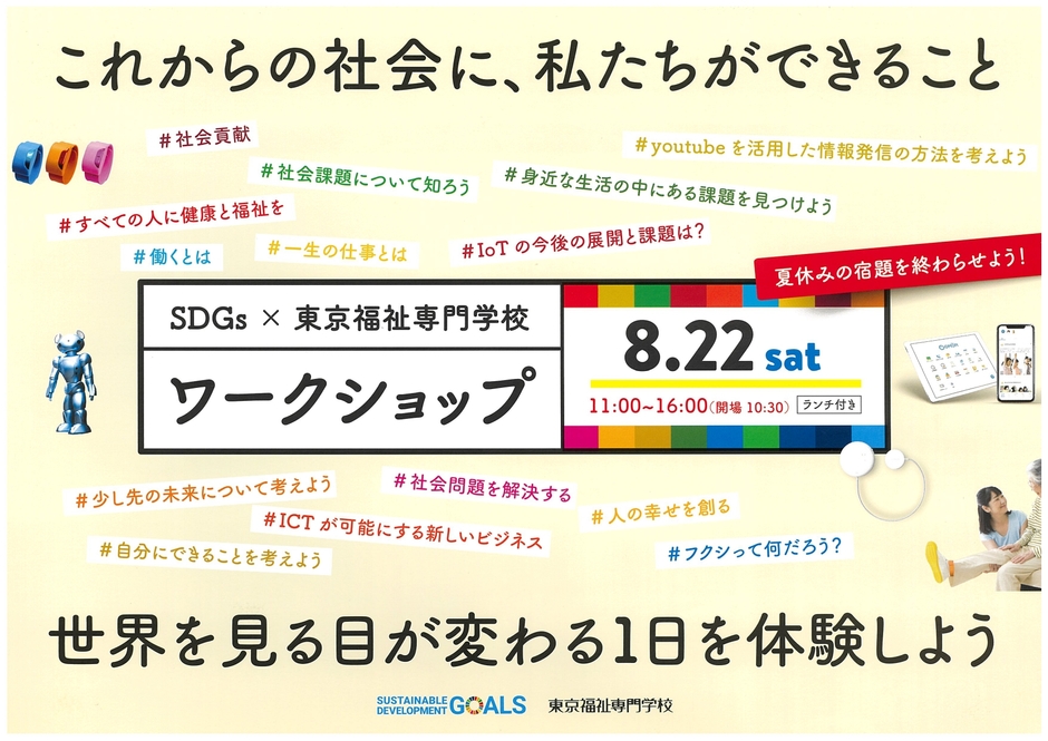 SDGsとは、2015年9月の国連サミットで採択された「持続可能な開発のための2030アジェンダ」にて記載された2016年から2030年までの国際目標です。この度、東京福祉専門学校の考える「ワークショップ」では、SDGsの中にある項目を福祉の視点で考え、福祉業界のイメージを広げ、社会課題について一緒に考えてもらうことを目的にしております。福祉業界において、難しい社会課題に取り組んでいる企業・団体の方々に来校いただき、新しい福祉の価値に触れて、学んでいただきけるコンテンツをご用意しております。