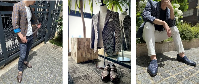 クールビズ、テレワークや在宅勤務でビジネスとカジュアルの線引きが曖昧になりつつある今、コロナ禍も重なり、スーツの着用シーンは激減しています。その中で当社は、ビジネスでもカジュアルでも使える、着回しがきく合理的なスタイル、高品質なオーダーメイドの『ジャケット×パンツスタイル』を提案しています。しかしながら「コーディネートが難しい」「着こなし方がわからない」というお声を頂戴することもありました 。そのお悩みを解決するため立ち上げた新サービスが今回の『ジャケットとシューズリンクコーデ仕立て』です。「何を着たらいいのか服装で悩む…」「コーディネートに時間がかかる…」「オシャレになりたい…」「見た目の大事さを理解している…」このような方々にとって、ニューノーマルな時代にふさわしい服とはどんな服だろう?私たちは考え続けました。そして、出てきた答えは、人と違う見た目にこだわる人はもっとこだわるようになるだろう、ということと、仕事でもプライベートでも気軽に着ることができるような、「ラクさ」。そこでリンクコーデ仕立てでは、ジャケットとシューズをサッとまとうだけで、バシッと決まる、そんな手軽さにもとことんこだわりました。ジャケットの生地をシューズにも使用することで色と柄を揃え、お手持ちのシンプルなインナーやパンツを合わせても統一感のある洗練されたコーディネートに仕上がります。