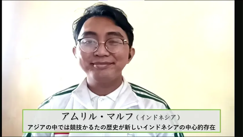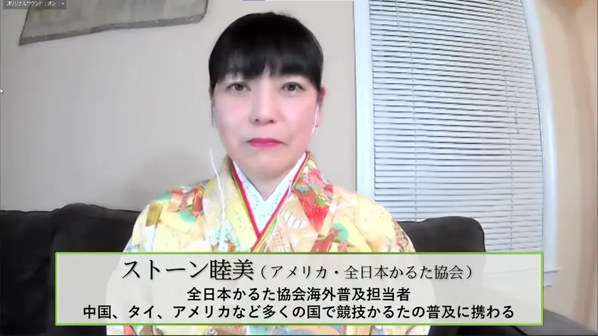 さらに海外からのリモート出演として、「第1回おおつ光ルくん杯競技かるた世界大会」優勝チームからカンタン・マヤールさん、アマンディン・シャンバロン・マヤールさん(フランス)、アジアの中では競技かるたの歴史が比較的新しいインドネシアからアムリル・マルフさん(インドネシア)、全日本かるた協会で海外普及を務めるストーン睦美(アメリカ)、計7名が、世界各地で愛好者が増える競技かるたの海外の実情や活動の展望について語り、会場からの質問にも答えていきました。