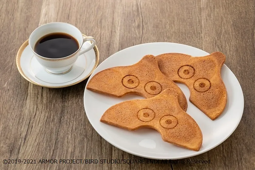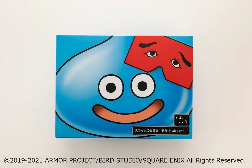 期間限定商品の「スライムにわかせんぺい」は、株式会社スクウェア・エニックスの人気ゲーム「ドラゴンクエストウォーク」とのコラボ商品として誕生しました。115年の歴史上、初めてカタチを変えての誕生です。スライム独特の目は職人が1枚1枚手押しにて焼印を押し命を吹き込んでいます。パッケージはスライムがにわか面をつけてインパクトがあり、また裏面は二〇加煎餅の意匠をいかしたデザインとなってます。