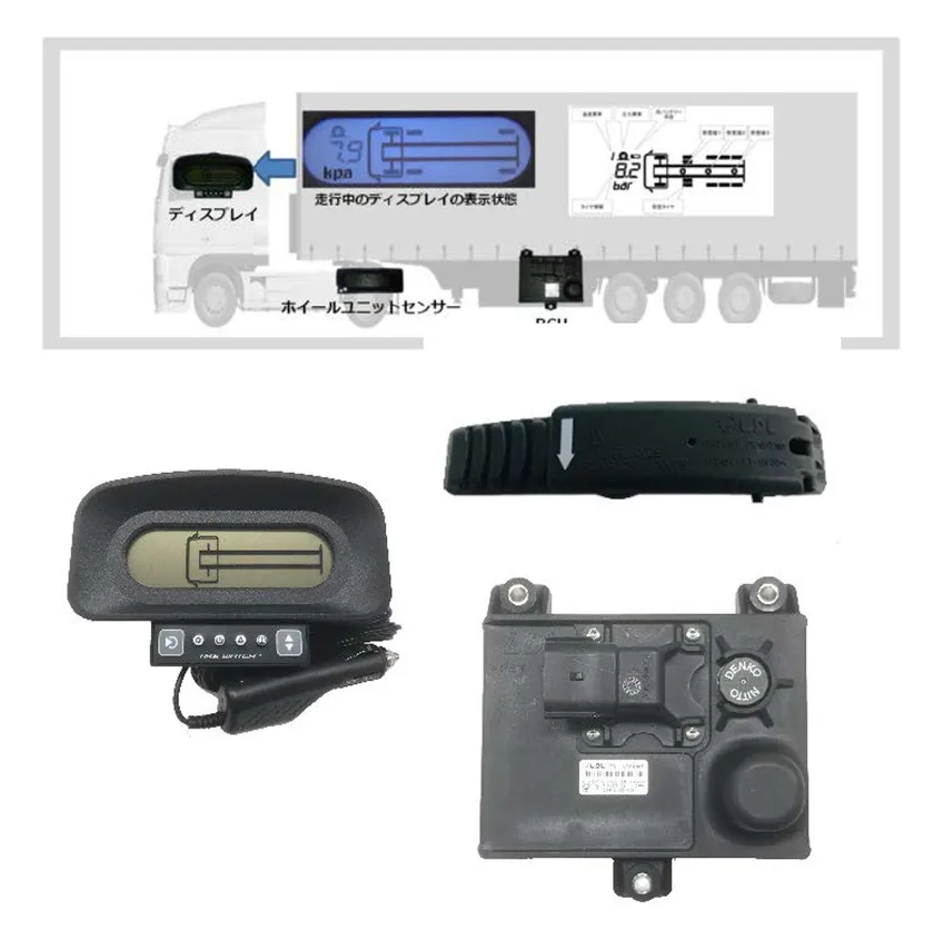 LDLテクノロジー社の提供するタイヤ空気圧監視システムは、タイヤホイールに装着するホイールユニットセンサ(空気圧・温度センサ)、RCU(受信機)、モニターディスプレイで構成されており、それぞれの機器が完全にワイヤレス化されているのが特徴です。