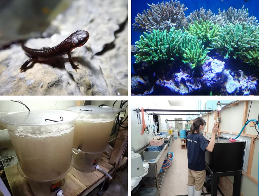 水族館の飼育員の仕事は、生き物の管理はもちろん採集や調査、機械メンテナンスなど多岐にわたります。バックヤードスペースでは実際に飼育員が日々行っている作業を見学。餌用プランクトンの培養や、通常展示では難しい希少生物の展示(暗視カメラや特殊な水槽を使用)や標本の展示のほか、タイミングが合えば飼育員から話を聞くことも可能です。「みとしーラボ」では遊びながら多彩な体験をすることができます。