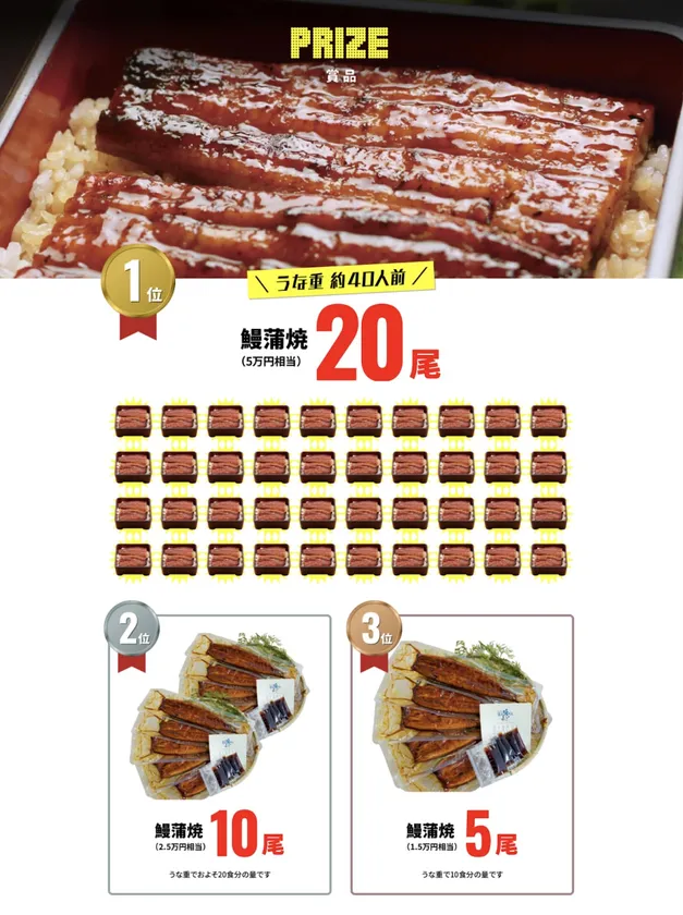 各部門1位は鰻蒲焼20尾(鰻重約40人前)