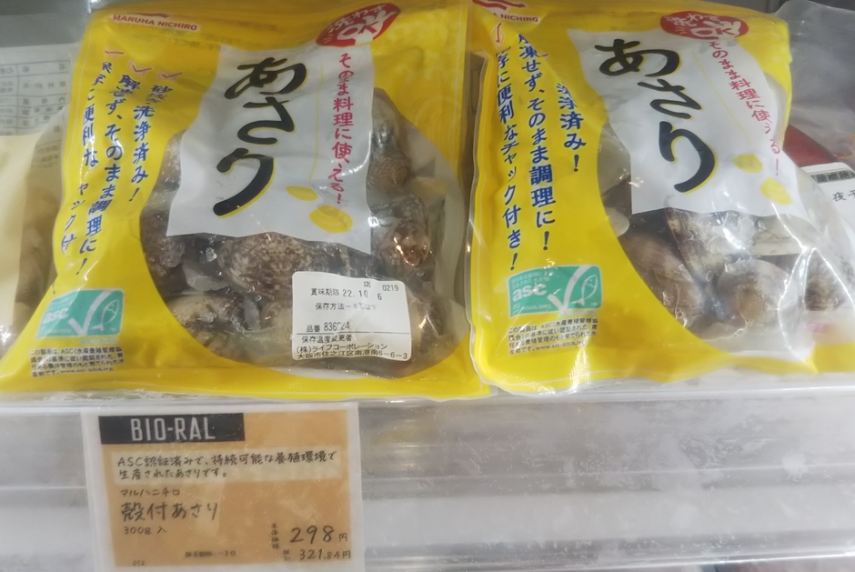 厳格な基準を満たした養殖場で生産された「ASC認証」のあさりを冷凍食品コーナーで取り扱いいたします。