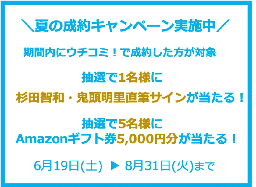 株式会社ウチコミ(本社:東京都新宿区、代表取締役:大友 健右)の運営する大家さんが直接入居者を募集する賃貸情報サイト「ウチコミ!」( https://uchicomi.com/ )は、2021年6月19日(土)より、ウチコミ!を利用して成約した入居者を対象にウチコミ!のCMのナレーションを務めている、人気アニメ『銀魂』の坂田銀時役を演じた杉田智和さんと『鬼滅の刃』竈門禰豆子役を演じた鬼頭明里さんの直筆サイン色紙が当たる成約キャンペーンを実施いたします。