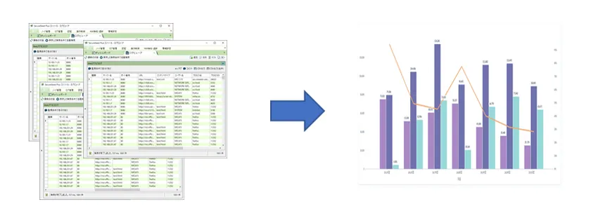 今回SecureSeed Plusに新たに追加された「ログ出力機能」では、クライアントPCから取得したログをBIツールなどにより見える化し、アプリケーションの利用状況や作業状況から自動化などによる作業の効率化などへの業務改善へつなげます。