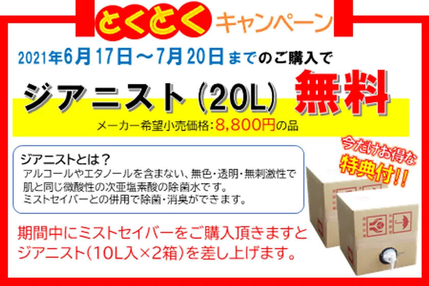 株式会社宮川商店(本社:滋賀県長浜市宮前町12-6、代表取締役:宮川 裕道)は、2021年6月17日から7月20日までの間、宮川商店本店Webショップにおいて、業務用大型超音波噴霧器「ミストセイバー」をお買い上げいただいたお客様に、もれなく次亜塩素酸水溶液「ジアニスト」20リットルをプレゼントさせていただく「とくとくキャンペーン」を開催いたします。