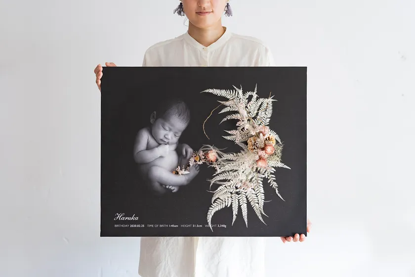 等身大の赤ちゃんをプリントしたモノクロのキャンバスをドライフラワーで彩る
