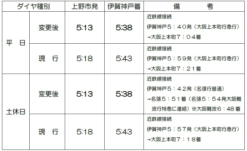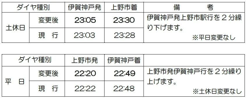 (1)お客様の利便性を図るため、上野市発伊賀神戸行始発列車の時刻を繰り上げます。