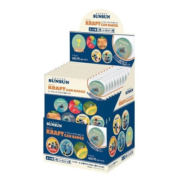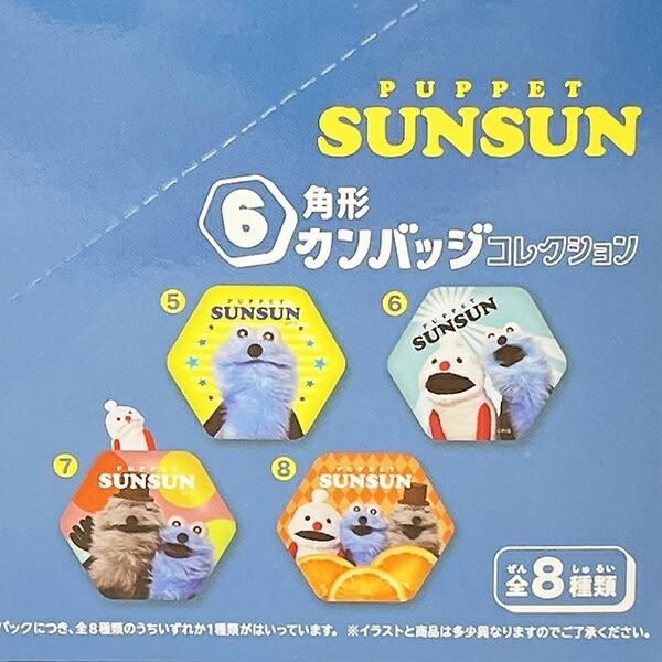 続いてこちらは既存アイテム。実はもう終売が相次いでいて、ちょっと手に入りづらいかもしれません。珍しい6角形の缶バッジが全8種のコンプリートBOXです。バッグやポーチに付けて、周りにパペットスンスン好きをアピールしましょう!