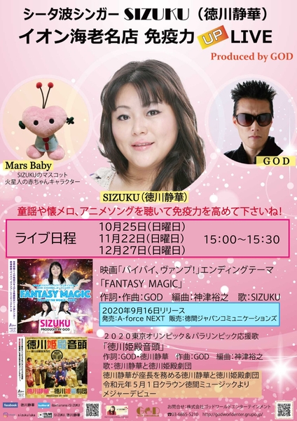 また、6月から定期的に行っているイベントとしてイオン海老名店 太陽の広場での「SIZUKU免疫力UPライブ」があります。毎月最終日曜日15時~行っていますので、SIZUKUの歌を生で聴いてみたい方、会ってみたい方は、是非、お越しください。ライブの模様はSIZUKUのFacebook(徳川静華)でライブ配信も行いますので、お越しになれない方は配信でお楽しみください。
