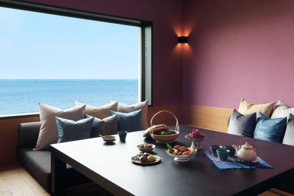 星のや沖縄のコンセプトは「グスクの居館」です。美しい海を望む絶景のロケーションで、沖縄の歴史や文化を感じられる、沖縄の贅沢を集めた空間を目指したいと考え、沖縄県・読谷村で開業しました。施設内には紅型の壁紙や、読谷村の伝統的な織物「読谷山花織」を使ったコースターなど、様々な工芸品を取り入れています。中でも、読谷村の代表的な工芸品である「やちむん」は数多く揃え、お客様が実際に手に取って魅力を感じられる機会を設けています。