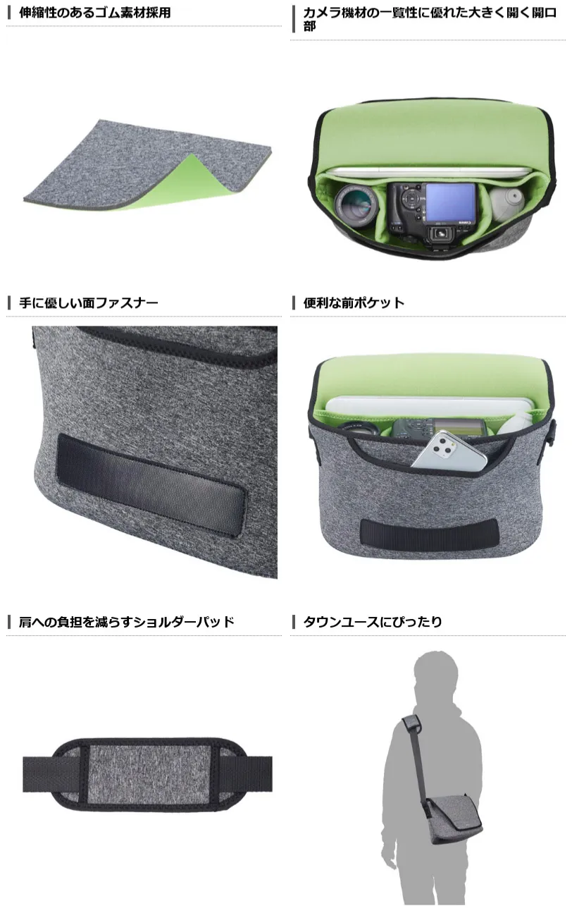 ウェットスーツなどに使用される伸縮性とクッション性を兼ね備えた素材を採用。弾力のあるクッションと裏面に使用している起毛素材でカメラを傷や衝撃からやさしく保護します。