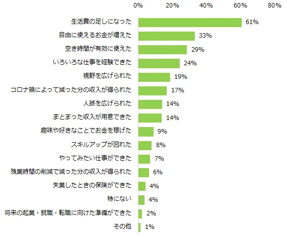 仕事のかけもち・Wワーク・副業をしたことがある方に、仕事のかけもち・Wワーク・副業をして良かったことを伺うと、第1位は「生活費の足しになった」(61%)、第2位は「自由に使えるお金が増えた」(33%)、第3位は「空き時間が有効に使えた」(29%)でした。
