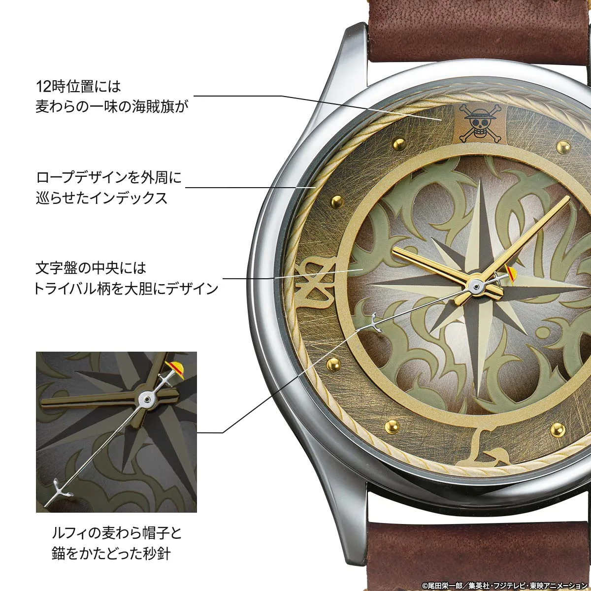 中央に大胆にデザインされたのは、トライバル柄とコンパス。インデックスの外周をロープデザインで囲んだ海賊テイスト満載の文字盤。秒針は、ルフィの麦わら帽子と錨をかたどったオリジナル。