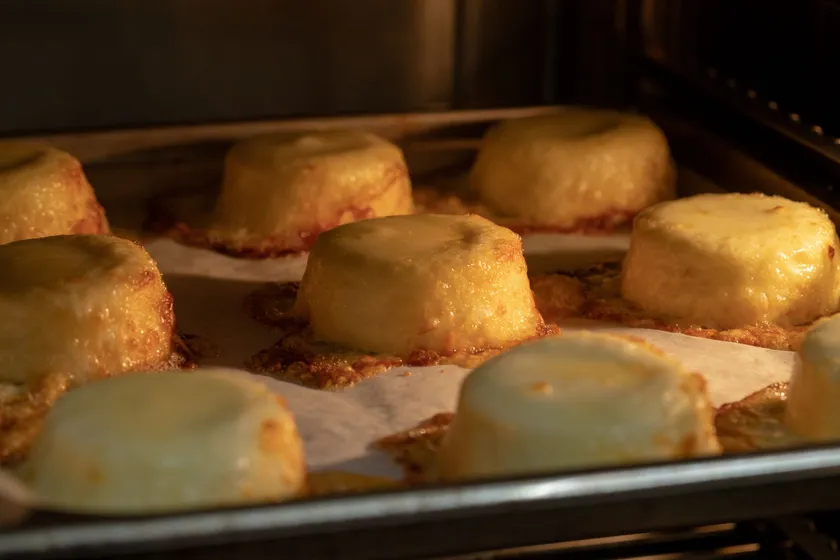 フランス産のクリームチーズと生クリームなどを練りこんだ白身魚のムースの中にフランス産の高級チーズ18ヶ月熟成のコンテ エクストラ ルコットを入れ表面に厚切りのモッツァレラチーズなどをトッピングしオーブントースターで焼いていただくとチーズがとろけだす新感覚のチーズかまぼこ。