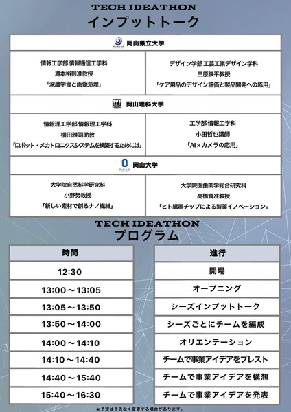 今回のテックアイデアソンでは、登壇いただく岡山3大学の先生が自ら磨き上げた先鋭技術をシーズとして捉え、参加者のみなさまの自由な発想力で事業アイデアの創出にチャレンジしていただきます。