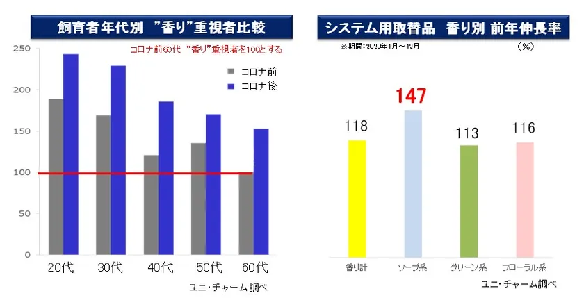 新型コロナウイルス感染拡大により在宅時間が増えたことで、猫の排泄物のニオイに不満を感じて、“香りで消臭すること”を重視する人が全年代で増加しています。また、香りの中でも、ソープ系の香りが最も伸長しています。