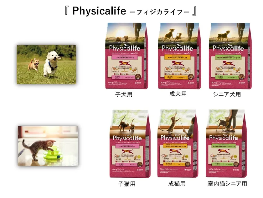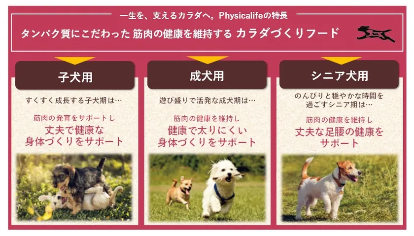 そこで、このたび、ライフステージに合わせた栄養設計でタンパク質にこだわった筋肉の健康を維持するカラダづくりフード『Physicalife -フィジカライフ-』を全国のペットショップで新発売します。