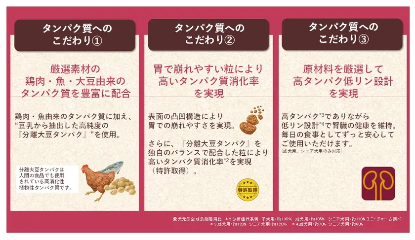 タンパク質消化率の高さを証明し、「大豆タンパクを含んだ消化性の高いペットフード」として特許を取得しました。