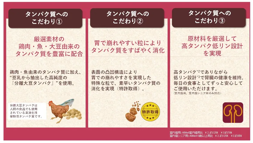 ・筋肉の発育に重要な子猫期から、足腰を維持したいシニア期まで、生涯にわたって健康なカラダづくりをサポートするラインナップで展開します。