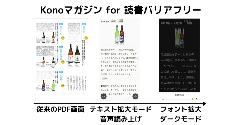 今回、国、社会全体の課題に対してイニシアティブをとって連携・推進している施設として、両館はKonoが持つ読書バリアフリーの可能性を更に広げるリッチな雑誌コンテンツに着目、情報アクセシビリティ、多様化/ダイバーシティで先行しているアメリカで導入が広がっている「Kono Libraries」を日本初、2021年7月より試験提供を開始します。現コロナ禍、図書館非来館型の利用へも活用を進め、リモートでもスマホアプリから閲覧、且つ従来のPDF閲覧へプラスした「好読/見やすいテキスト拡大モード」で障害の有無に限らず楽しめる電子雑誌閲覧を読み“聴き”放題で提供します。