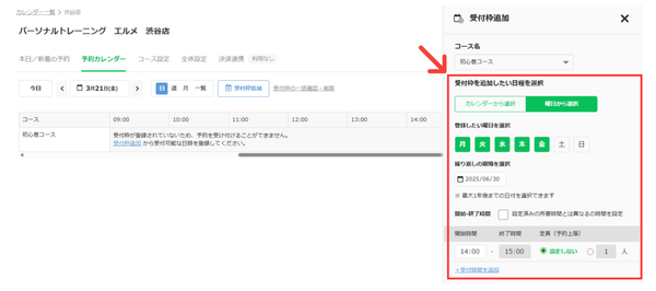 毎週決まった曜日・時間にレッスンを行っている事業者向けに、曜日ごとに受付枠を繰り返し登録できる新機能を追加しました。