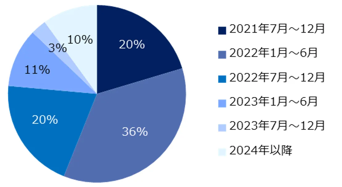 「新型コロナウイルスによる企業活動への影響は、いつまで続くと考えますか?」と伺いました。最も多かったのは「2022年1月~6月」(36%)でした。7割以上の企業が「影響が続くのは2022年内まで」(2021年7月~12月:20%、2022年1月~6月:36%、2022年7月~12月:20%)と考えていることが分かりました。