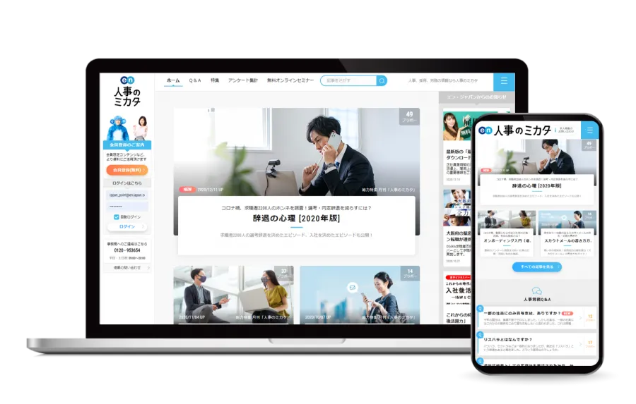 「採用面接ノウハウを知りたい」「求職者への対応方法を知りたい」といった人事の方の声にお応えする会員制サービス。採用・教育・評価・面接といった各種人事ノウハウの収集や必要書類のダウンロードをはじめ、人事・労務関係の法改正への対応など様々な場面でご活用いただける情報サイトです。