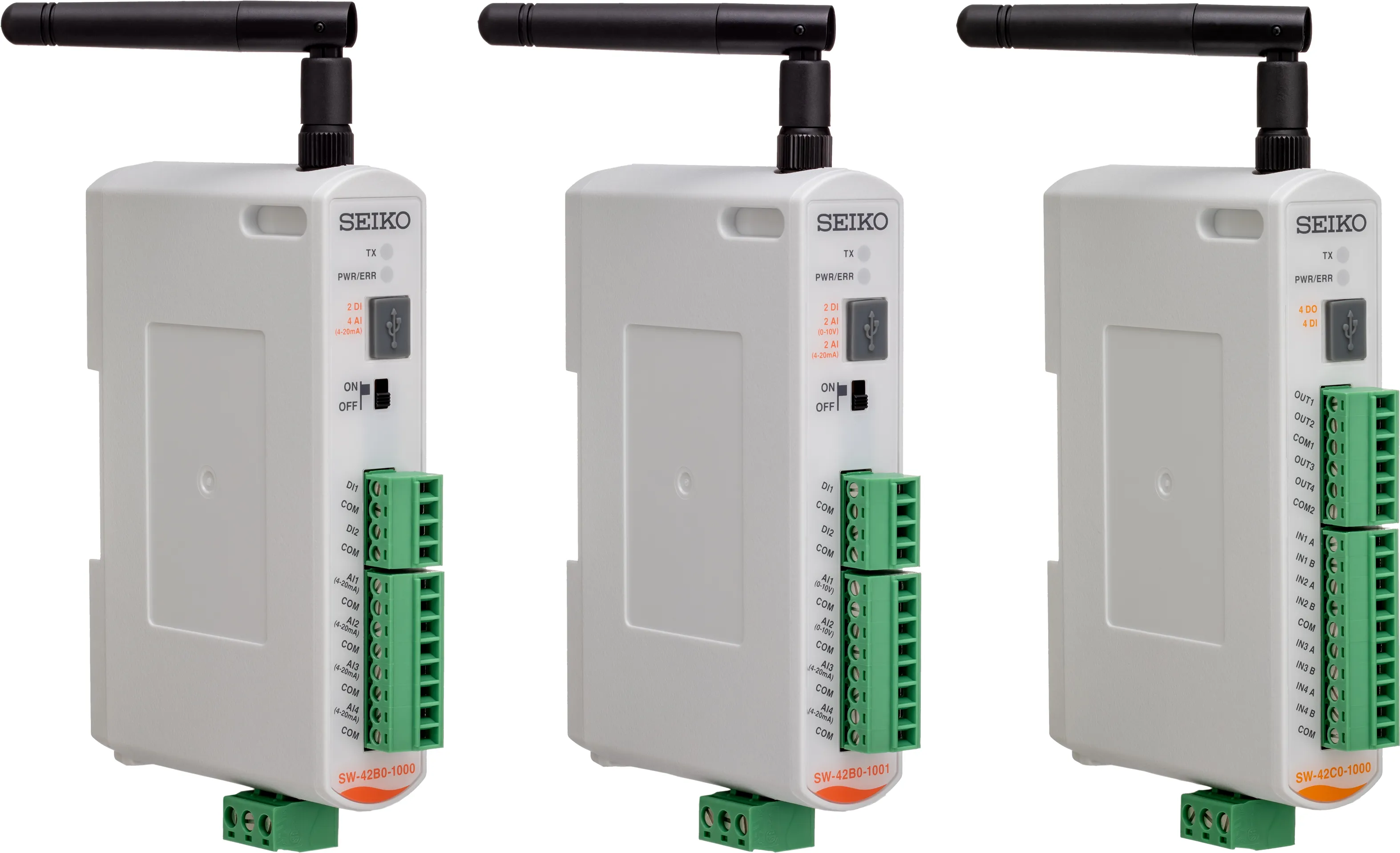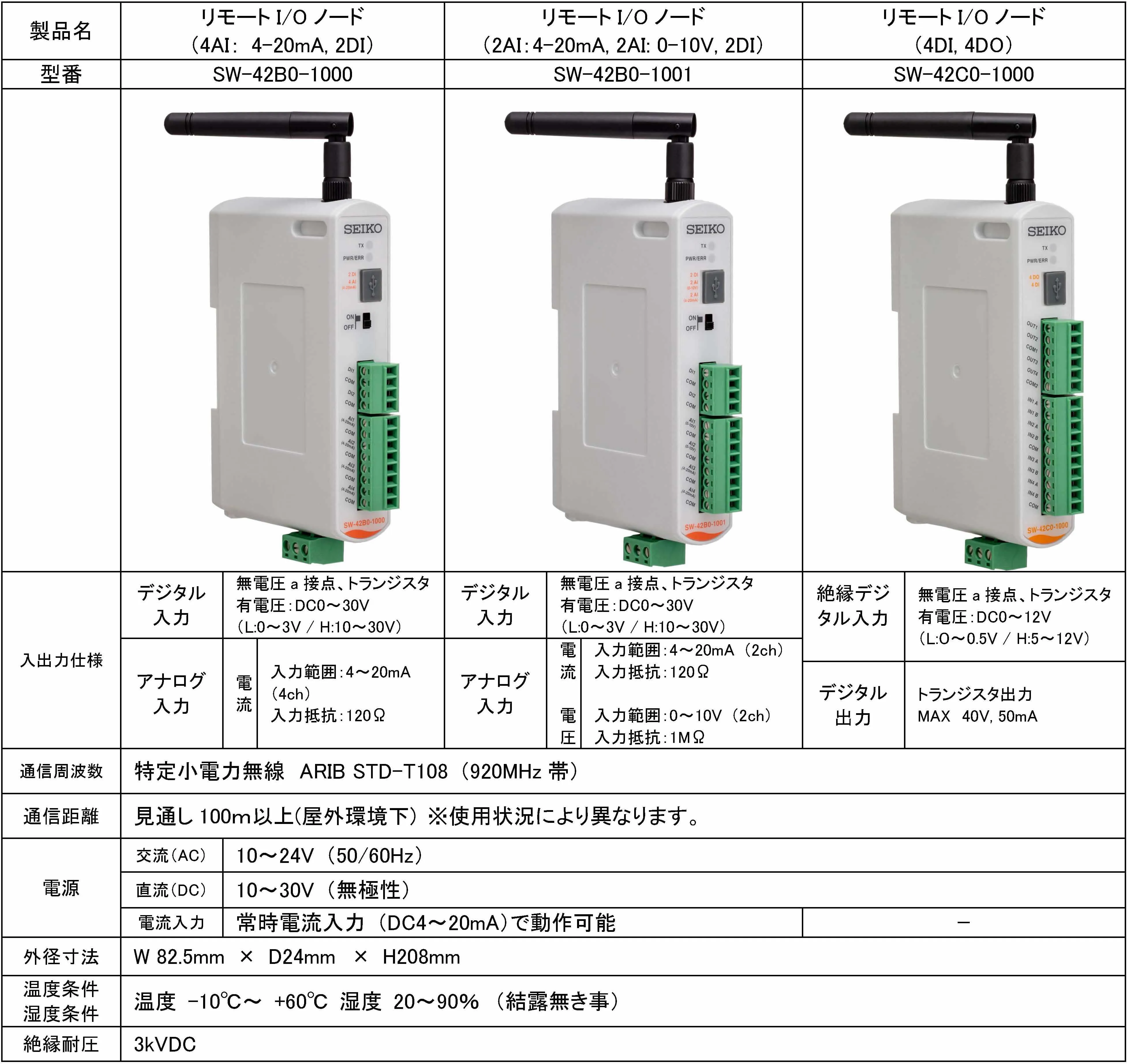 今回、販売するのは、アナログ信号取得用のリモートI/Oノード(SW-42B0-1000、SW-42B0-1001)と、デジタル入出力信号の取得制御用のリモートI/Oノード(SW-42C0-1000)の計3機種になります。
