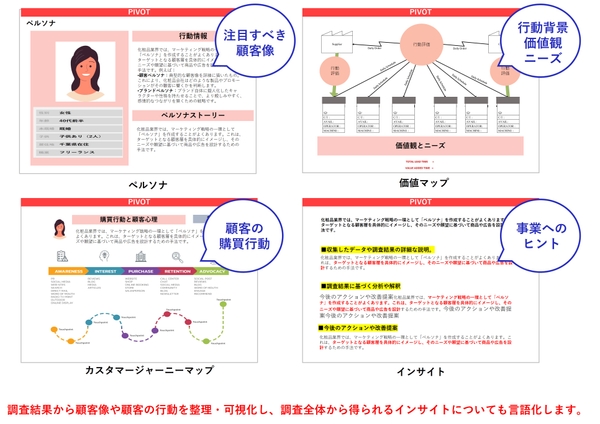 ペルソナシート、価値マップ、カスタマージャーニーマップなど、多角的な視点から顧客理解を深めるための詳細なレポートを提供します。