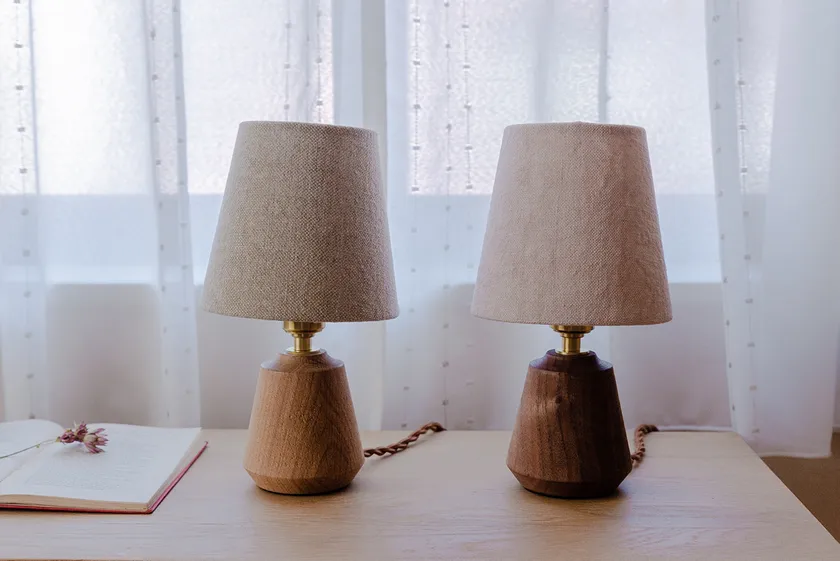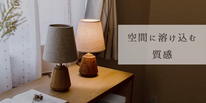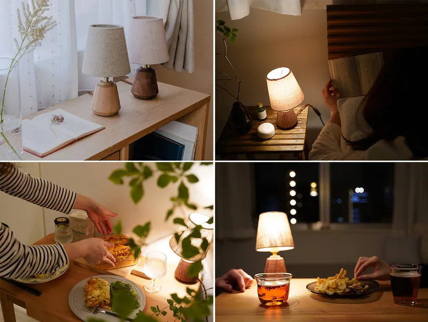 本棚やテーブルの上、ベッドサイドなど様々な場所に飾ることができます。また、使用する素材も無垢の木材やリネンの生地など天然のものにこだわりました。他のインテリア小物で使われるガラス・陶器・木材などの素材や、植物の隣に置いても違和感が出ないことに徹底的に配慮し、空間になじむ灯りを追求いたしました。デザインについては、暮らしの中で長く使ってもらえるよう装飾はあまりおこなわず、どこか野暮ったさが感じられるような愛着のわく形とバランスに仕上げております。
