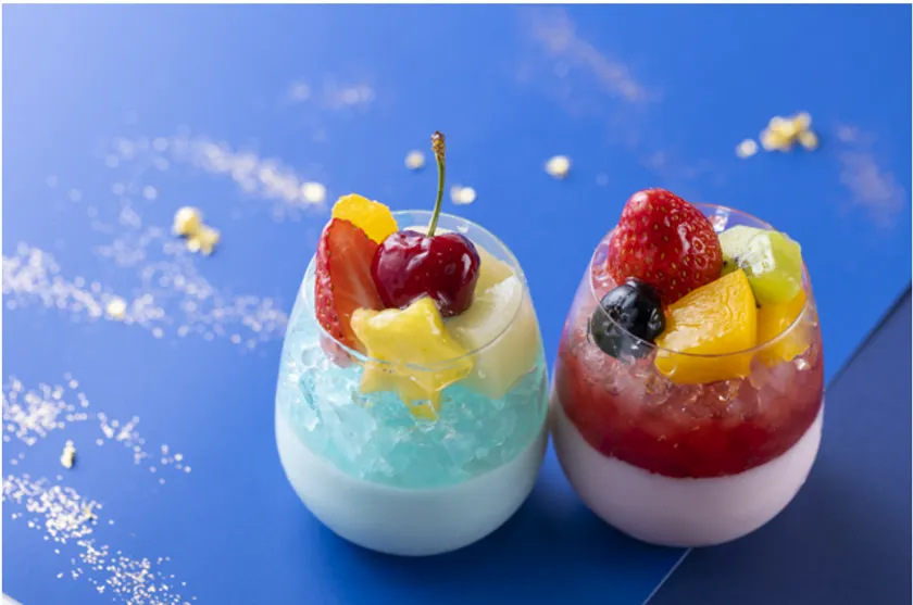 七夕の夜空をイメージしたゼリームース。ヨーグルトラムネムースとラムネゼリーが爽やかな味わい。いちご、パイン、桃、オレンジ、さくらんぼなど色とりどりのフルーツを乗せた、七夕限定スイーツです。