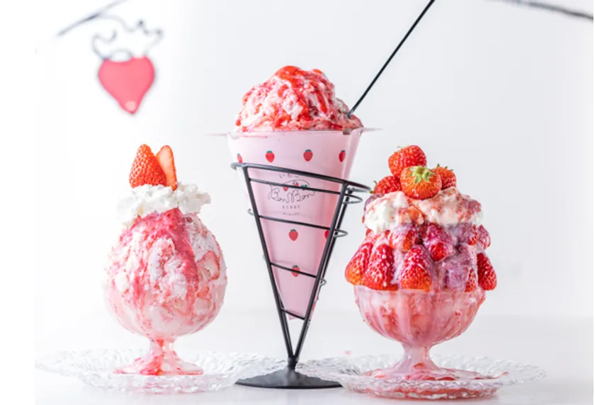「(左から)いちごおり、ボンボンかき氷、いちごおりデラックス」