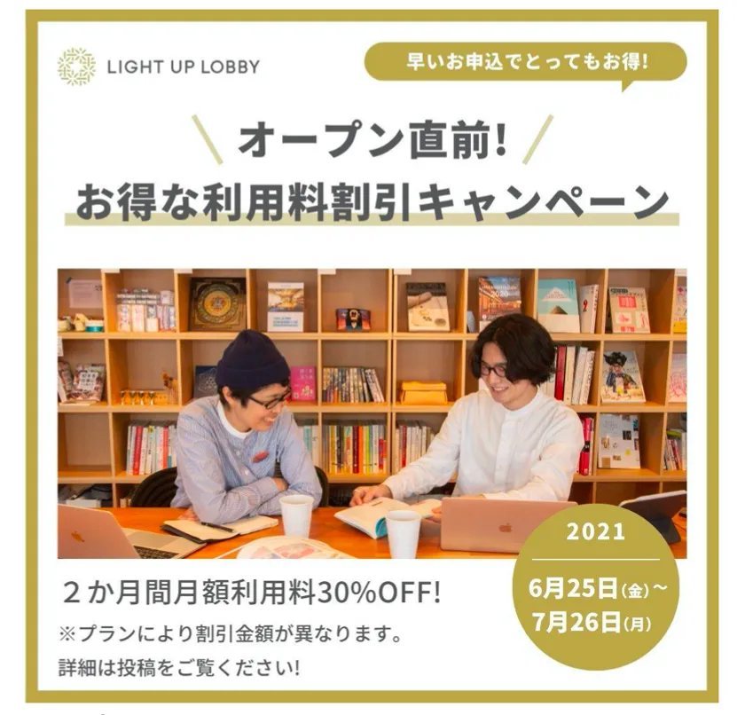 オープン前にいち早くお申込みいただいた方に、コワーキングスペースとシェアキッチンそれぞれの利用料が2ヶ月間30%OFF〈最大で約17,000円OFF〉となります。