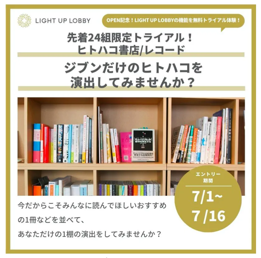 先着24組限定のオープンから1ヶ月間のトライアル。本やレコードの展示(販売はできません)として、ヒトハコ書店/レコードでのブース利用&演出体験が無料でできます。