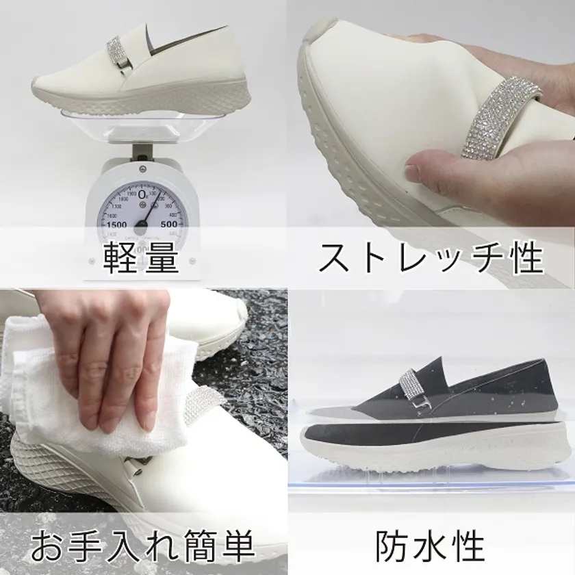 足もとに視線を集めるキラキラのストーンはその日の気分で付け外しができる2way仕様です。ボリュームのあるフレアソールが全身のバランスを整え、脚を華奢に見せます。