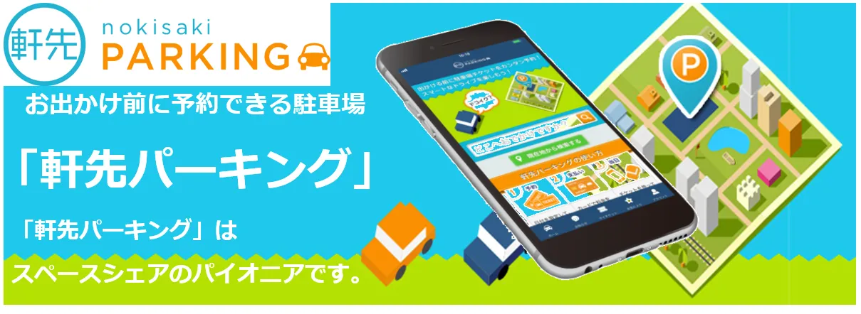 軒先パーキングは、予約制の駐車場シェアサービスです。自宅の駐車場やアパート・マンションの空き駐車場、月極駐車場、空地などを貸したい方と、イベント・観光・ショッピングなどの利用を目的に駐車場を使いたい方をインターネット上でマッチングします。