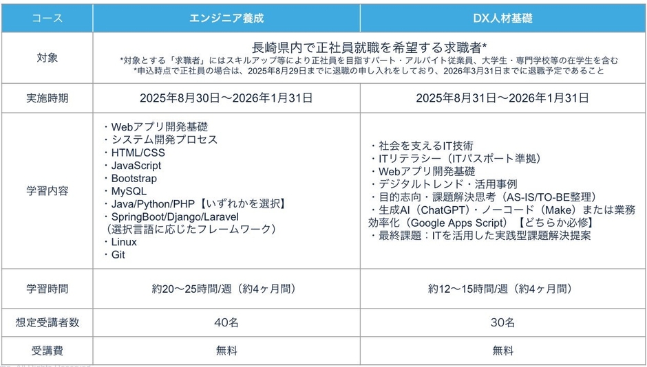 本講座は、「エンジニア養成コース」と「DX人材基礎コース」の2コースに分かれ、長崎県で活躍するITエンジニアや、DX(デジタル)化を推進する人材を育成します。