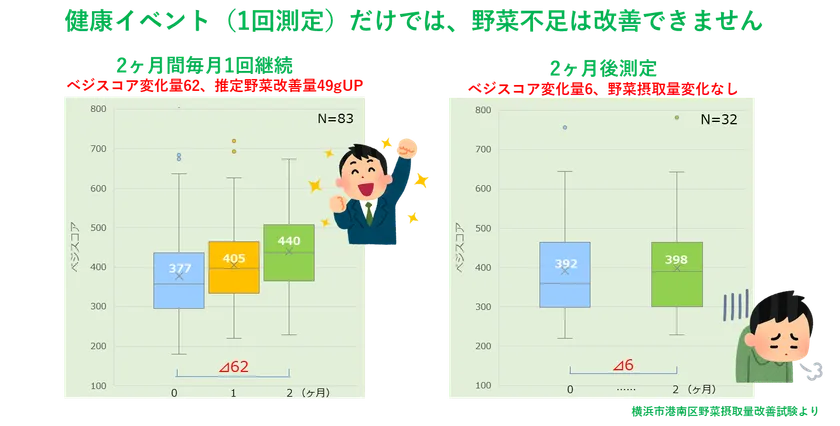 しかしながら、野菜不足をスコアで指摘して「気づき」を与えるだけでは、野菜不足は改善しないことが確認されています。